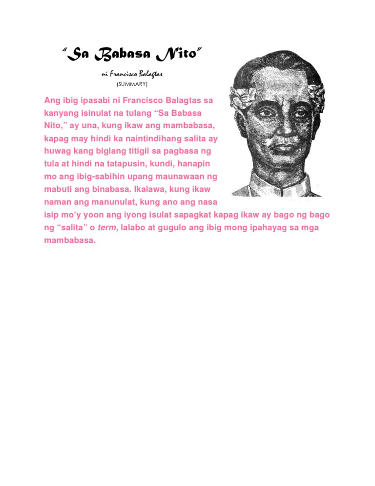 Sa babasa nito ni francisco balagtas paliwanag - 1349052 Ang SA BABASA NITO. 2 Kung sa biglang tingiy bubot at masaklap palibhasay hilaw at mura ang balat. View portfolio2 from CBA 101 at National University Philippines.