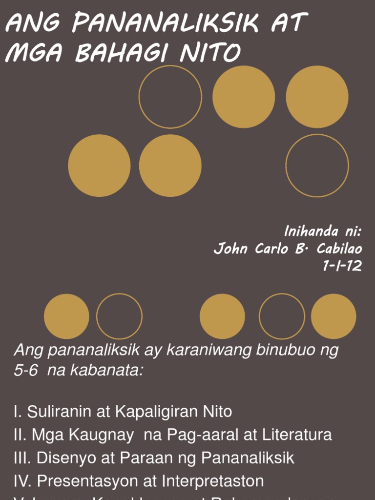 Kahulugan Layunin Katangian Ayon kay Aquino 1974 ang pananaliksik ay isang sistematikong paghahanap sa mahahalagang impormasyon hinggil sa isang tiyak na paksa o suliranin. Ay karaniwang nagpapahayag tungkol sa seryosong paksa at karaniwang isinusulat na may taglay na maiging pag-aaral o pananaliksik ng may akda. Pamagating Pahina - Ang tawag sa pahinang nagpapakilala sa pamagat ng pananaliksik.