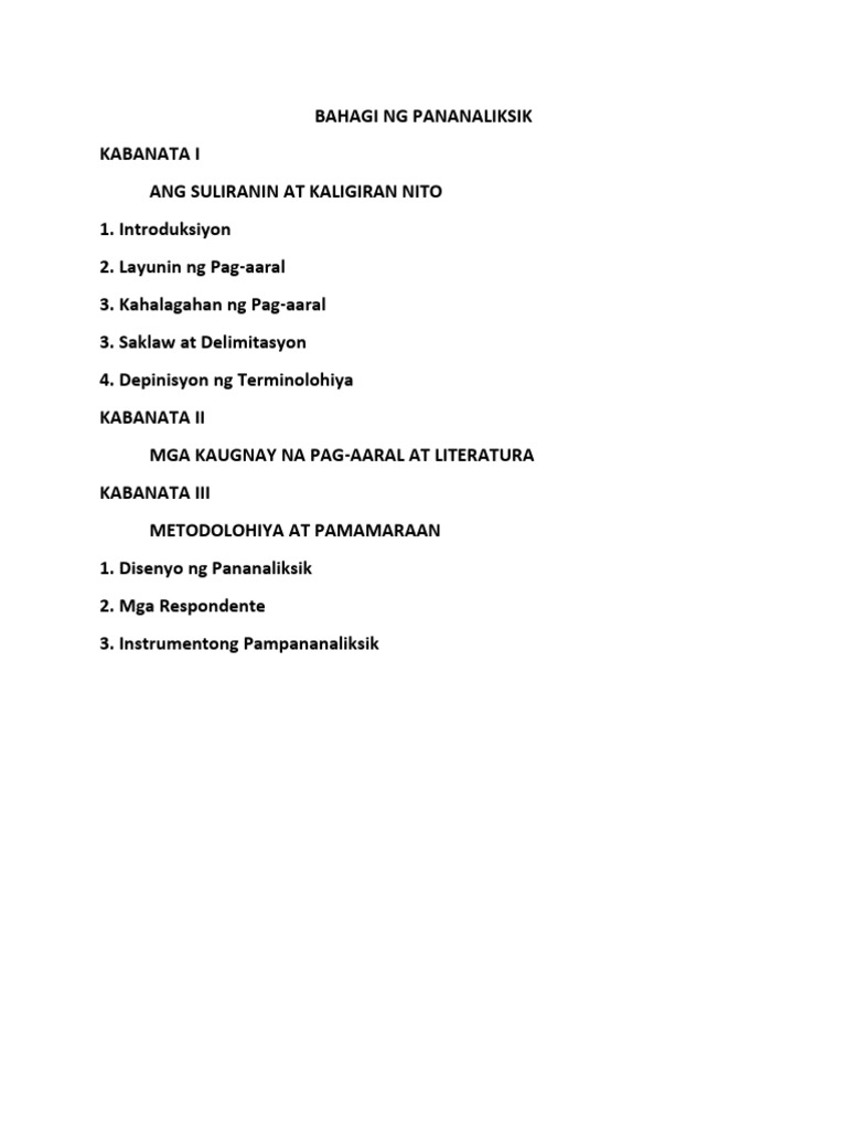 Ang isang pananaliksik ay may apat na kabanata. Panimula- Nagpapaliwanag ang bahaging ito ng malawakang paglalarawan ng pag-aaral at bumabanggit ng mga. Bukod rito ginagamit rin ang pananaliksik para ma bigyan solusyon ang mga problema at suliranin ng lipunan.