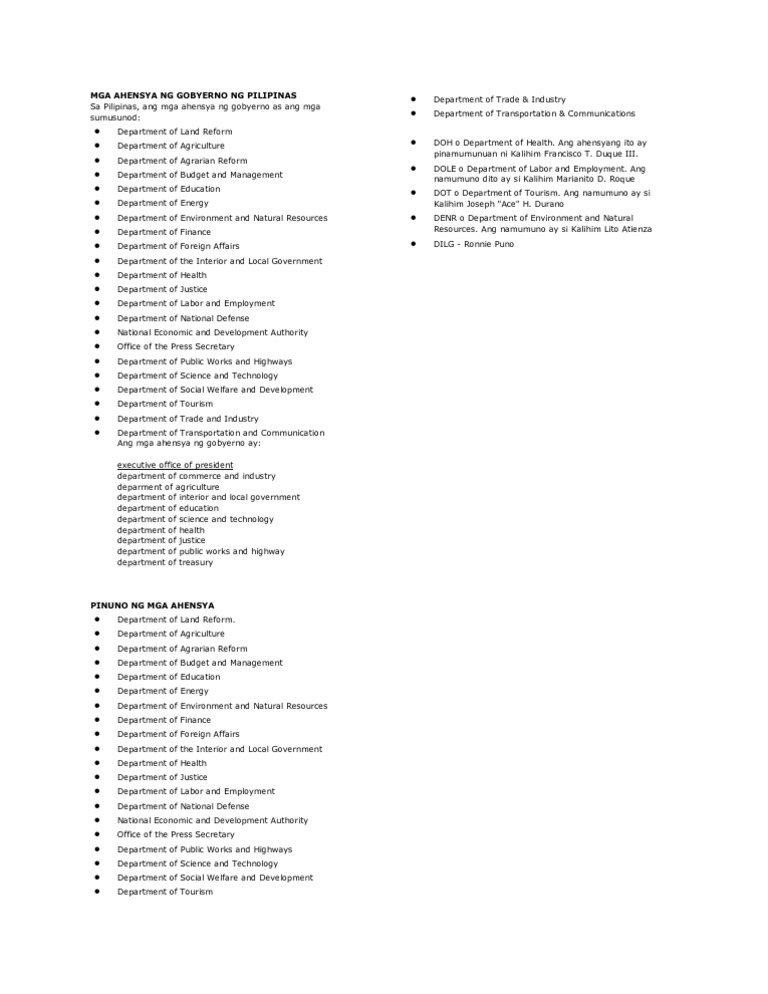 Mga ahensya ng pamahalaan at tungkulin nito tagalog. Pinamumunuan ito ng Pangulo ng Pilipinas bilang tagapangulo ng lupon ng NEDA kasama ang Kalihim ng. 11102020 Ahensya ng pamahalaan at mga proyekto nito. 71 years ago 1946-12-11 Type.