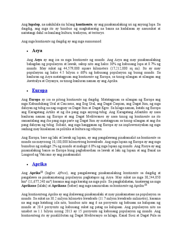 O 17159995 milyakuwadrado. Ang Asya Aprika Europa Hilaga at. 29122008 Ang kontinente ay ang pinakamalawak na masa ng lupa sa ibabaw ng daigdig.
