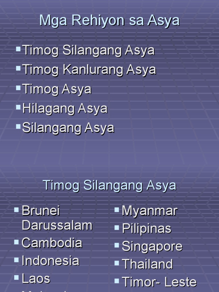Silangang Asya East Asia Timog-Silangang Asya South East Asia Timog Asya South Asia.