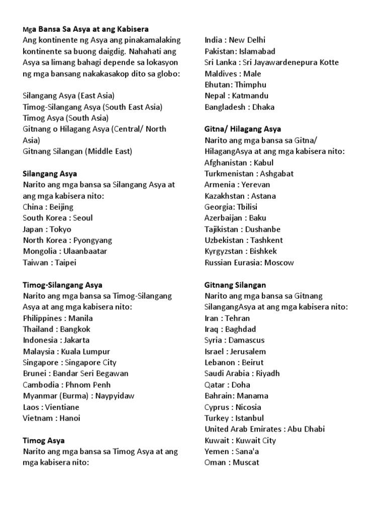 Ang asya ay ang pinakamalaking kontinente sa buong mundo. Mga Bansa sa Hilagang Asya at ang kabisera nito. Mga Bansa Sa Timog Silangan Asya at mga kabisera nito.